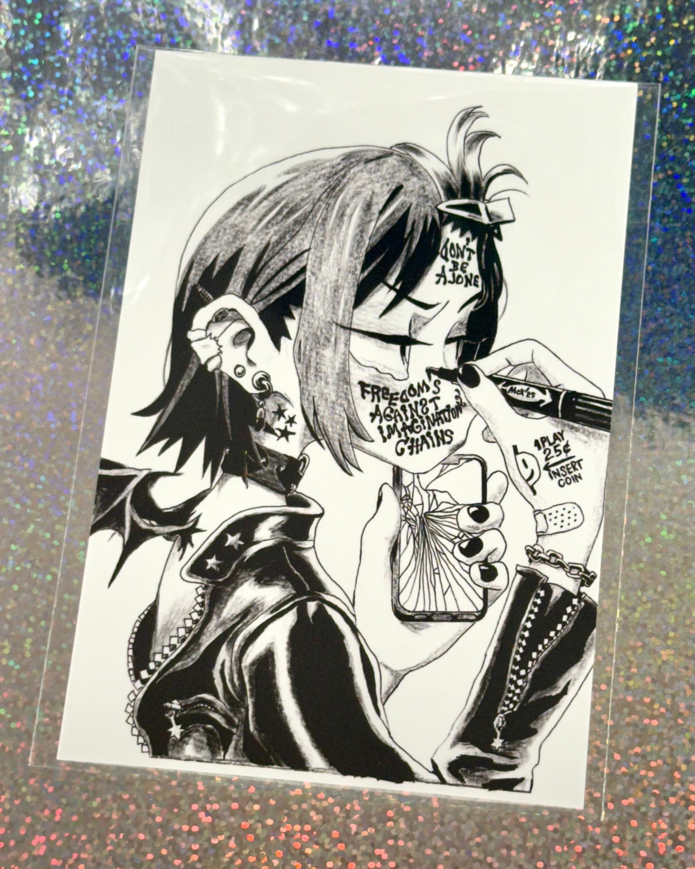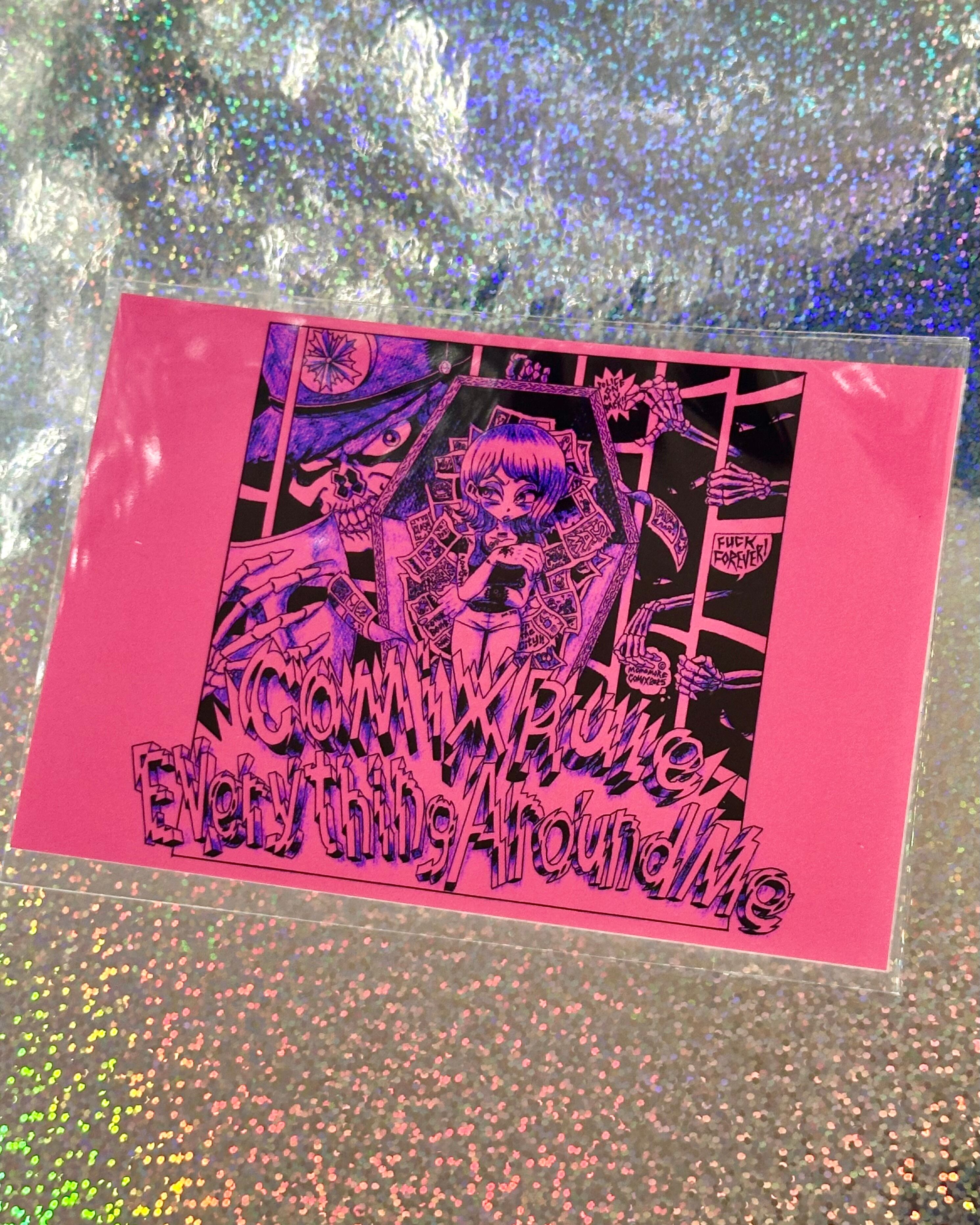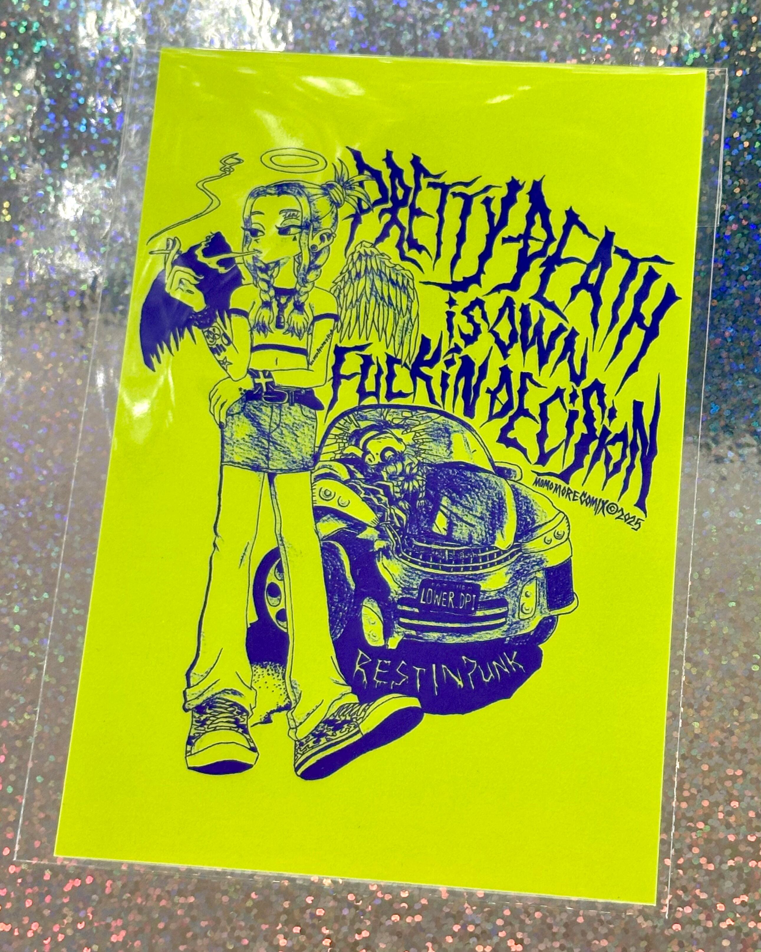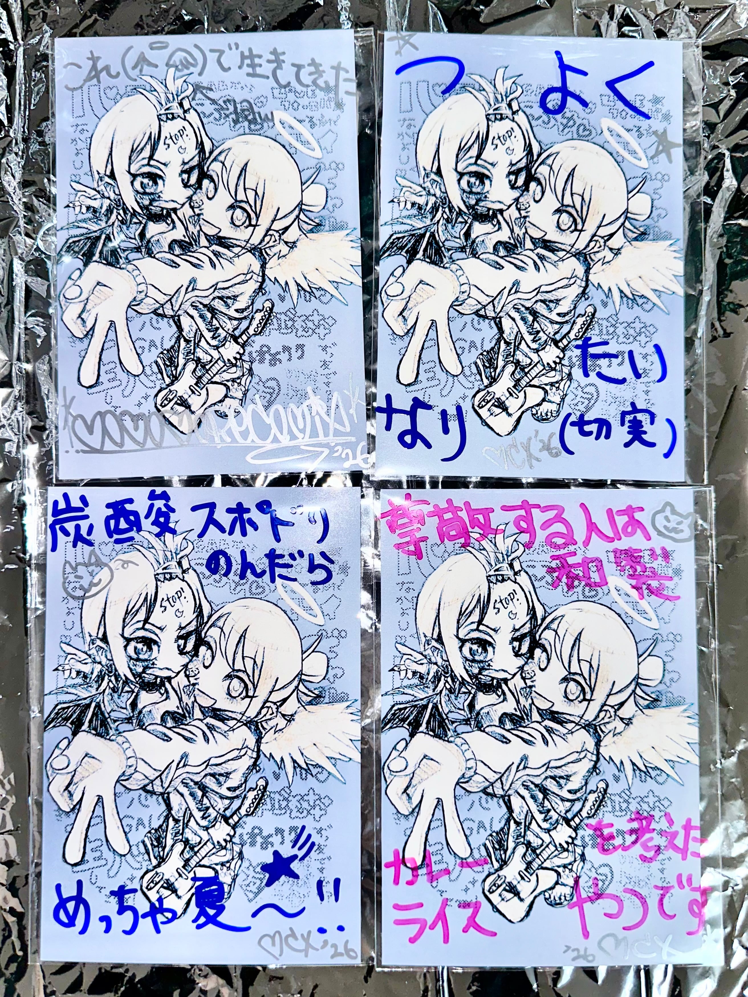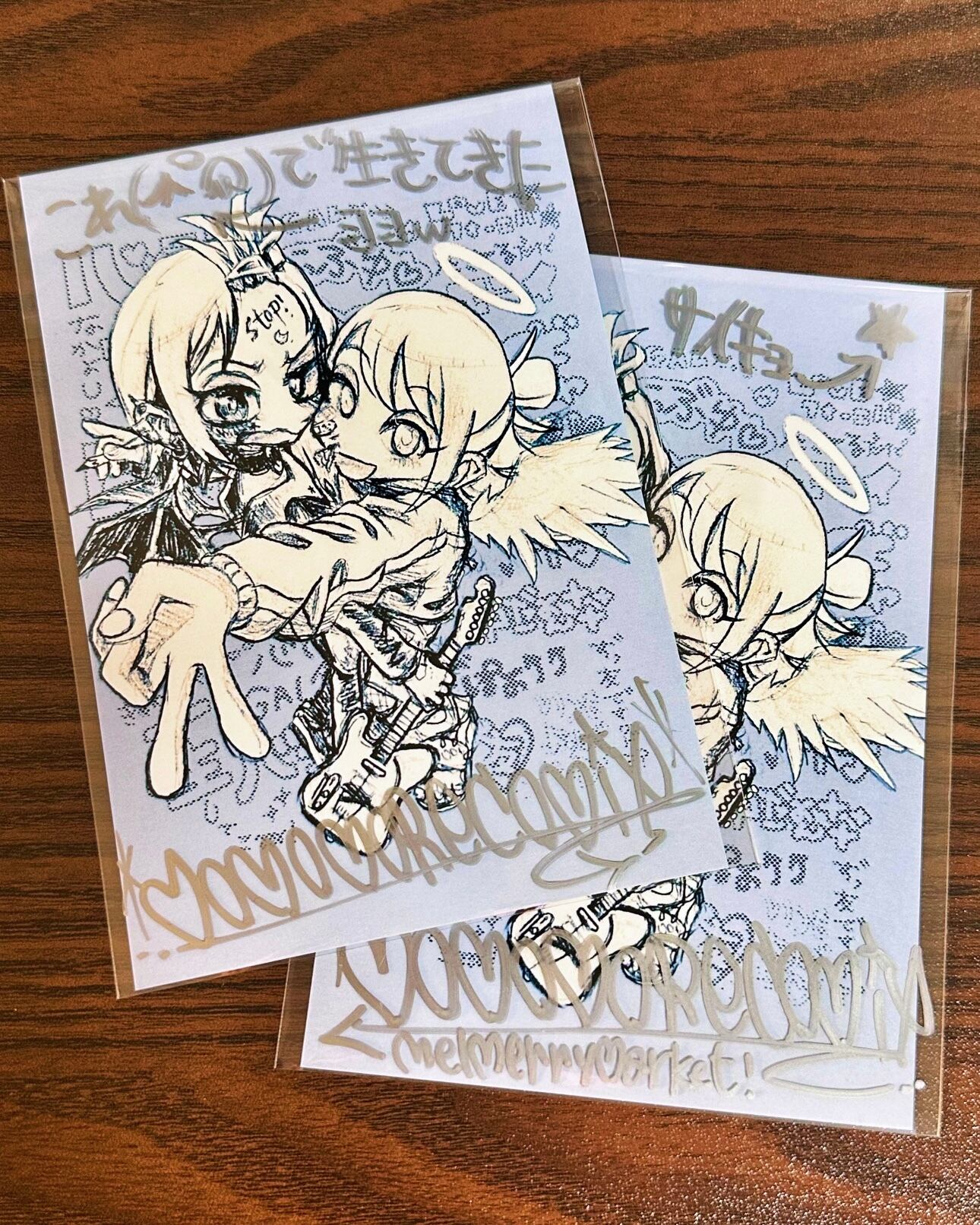 プリクラをイメージしたドローイング入りのポストカード1枚、イラストポストカード3枚、紙ラベルシール1枚のセットです。